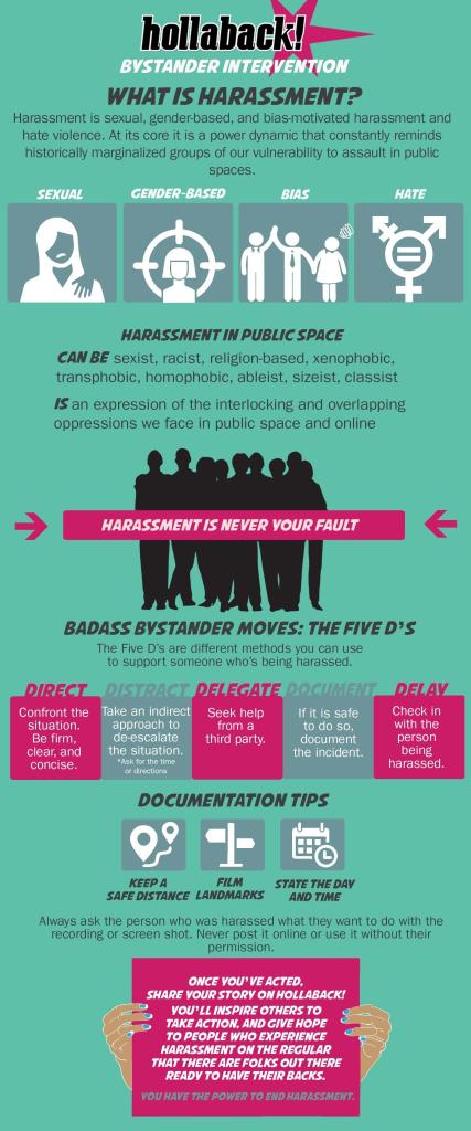 Wilmerding expressed her vision of the future, “we need to create a culture in which people who harass are held accountable for their actions. The most effective way that we can all contribute to this culture shift is by becoming active bystanders. The anti-harassment organization Hollaback! has a fantastic guide to bystander intervention, which includes the 5 D’s of intervention strategies: Distract, Delegate, Delay, Direct, and Document.”