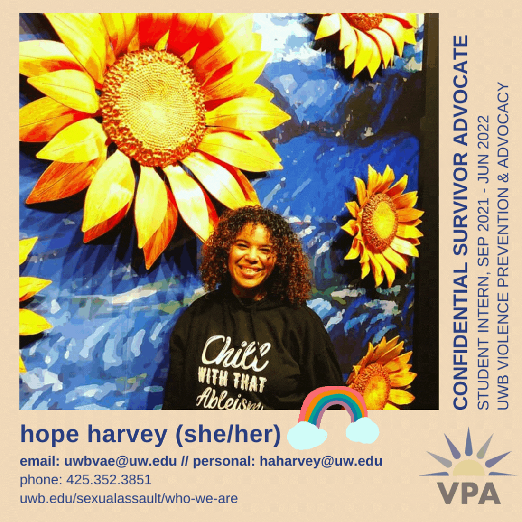 The Violence Prevention & Advocacy (VPA) program at UWB is a program dedicated to “fostering a community in which all students can access their education in an environment free of violence and harm… to transform our campus culture,” as the official VPA webpage states on the UWB website. VPA is committed to providing support for survivors and those who have been impacted by sex and gender-based violence and harassment and conducting prevention work for a safer UWB community.