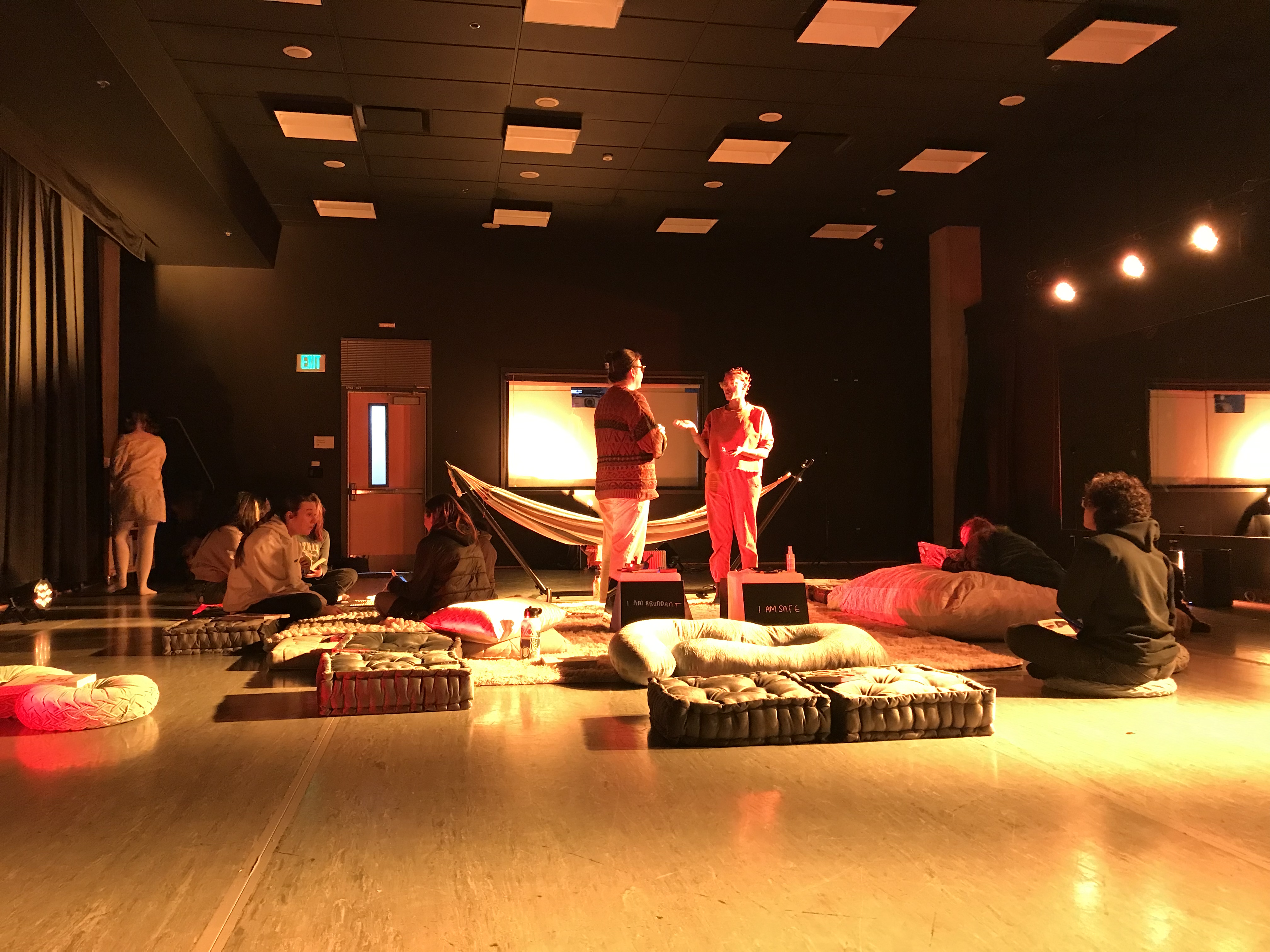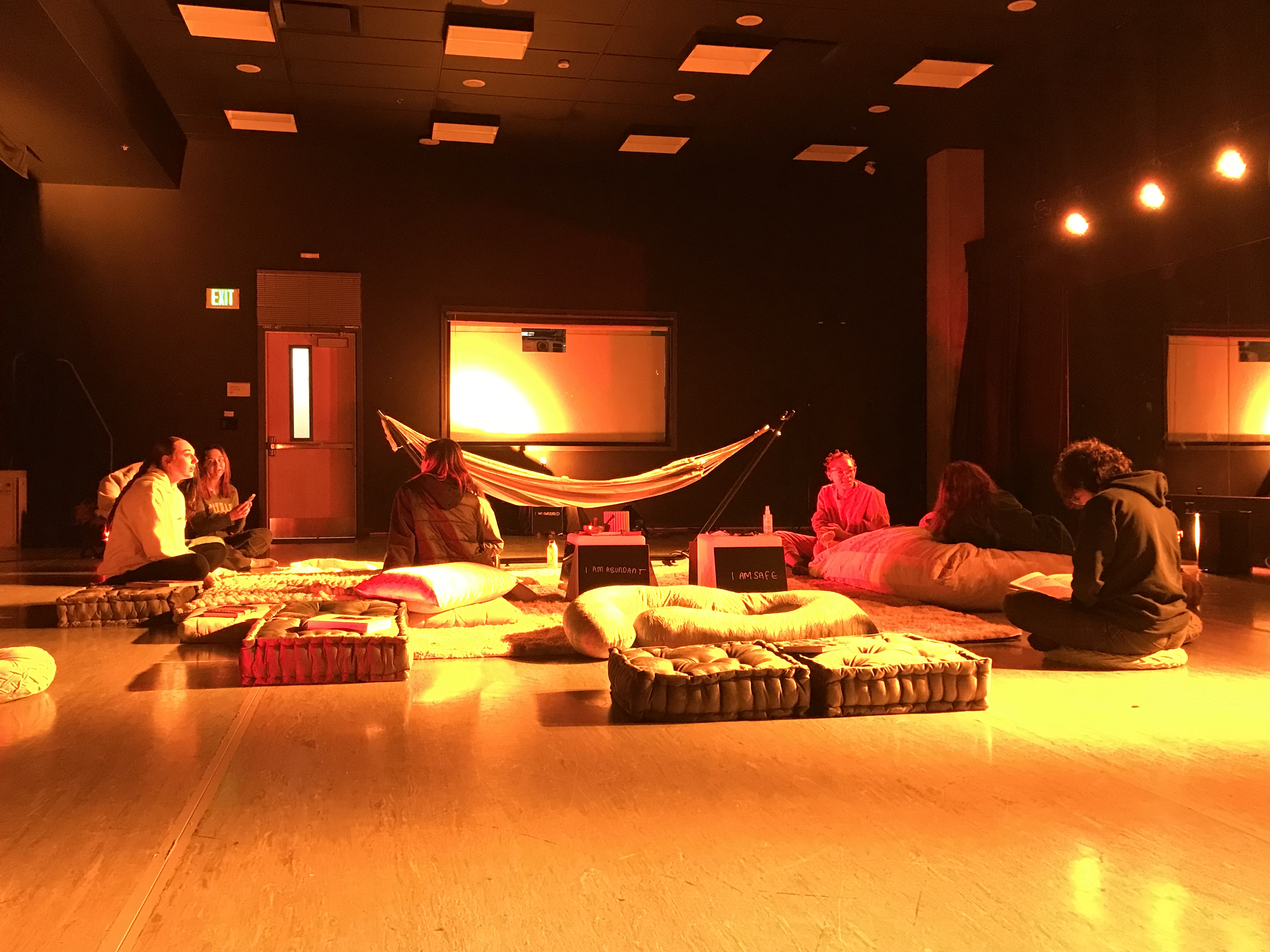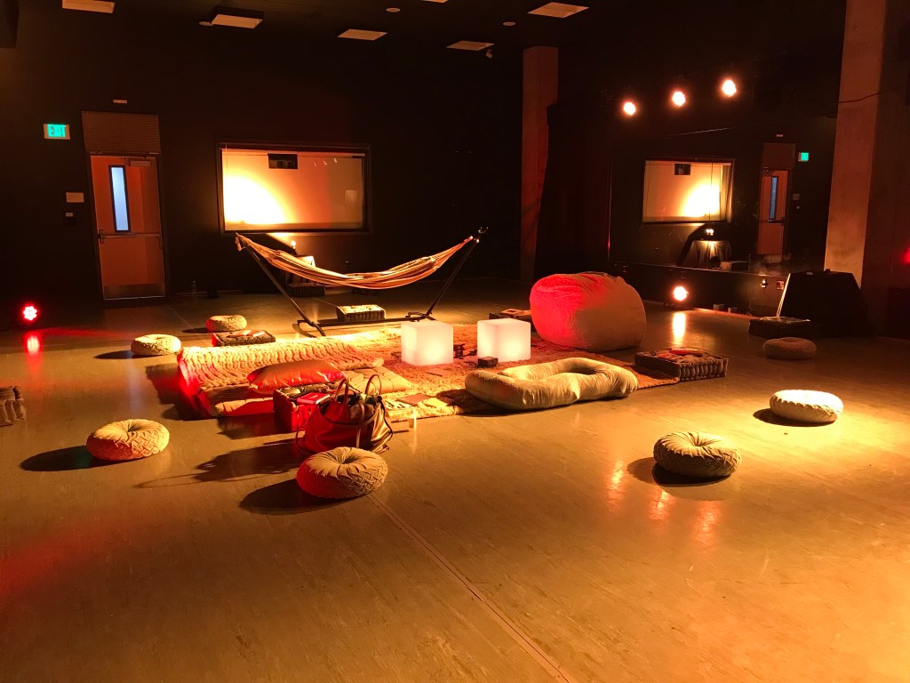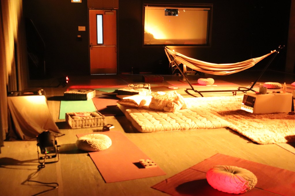 The Room provided a space on campus for students to have reparative rest, to learn more about global sleep technologies, and discuss their own habits in relation to rest. In each of the four cardinal directions, there was a cultural form of sleeping technology. There was a floor mattress from Japan to the east and a beanbag chair to the west, which Mia Imani joked matched the ‘extraness’ of Americans. To the south, there was a replica of a Congolese headrest, as well as a hammock to represent the feeling of being held by a caring figure, and in the north, there was a maternity pillow for body support. Additionally, yellow and red lights casted a warm orange glow to set a relaxing atmosphere and also helped to combat blue light exposure that people regularly face due to technology use.