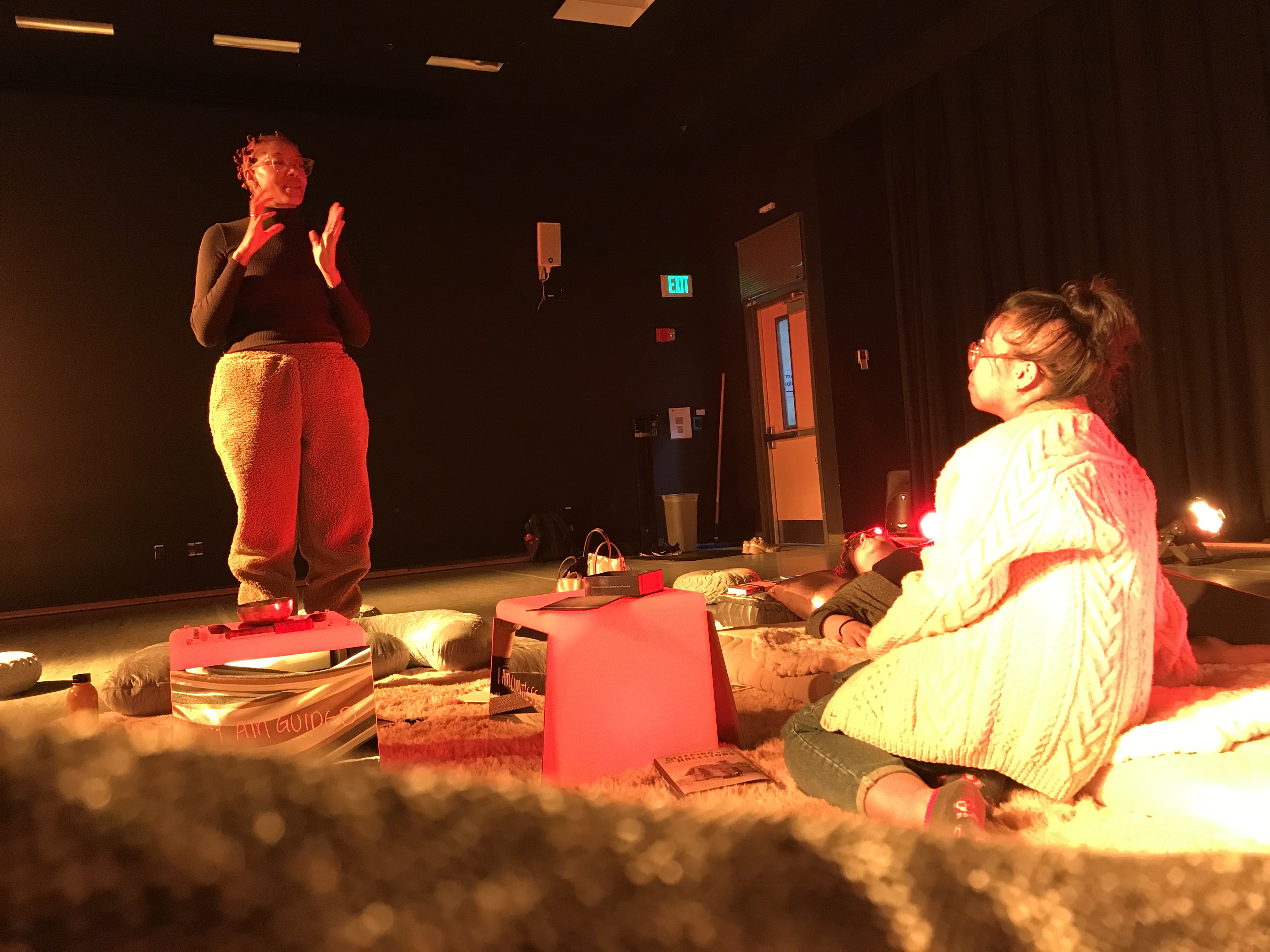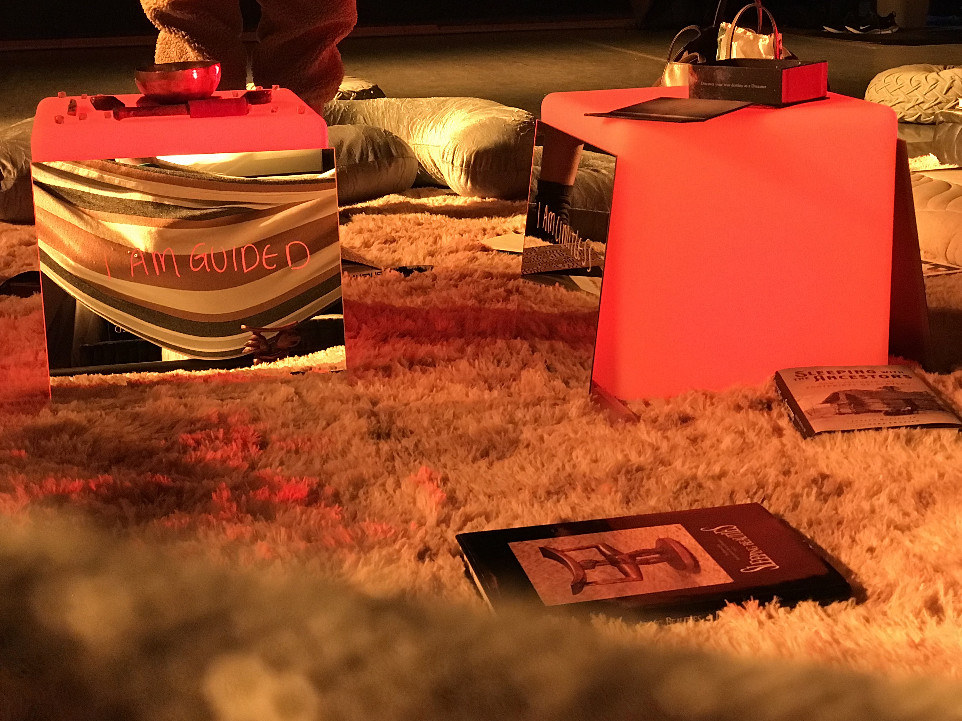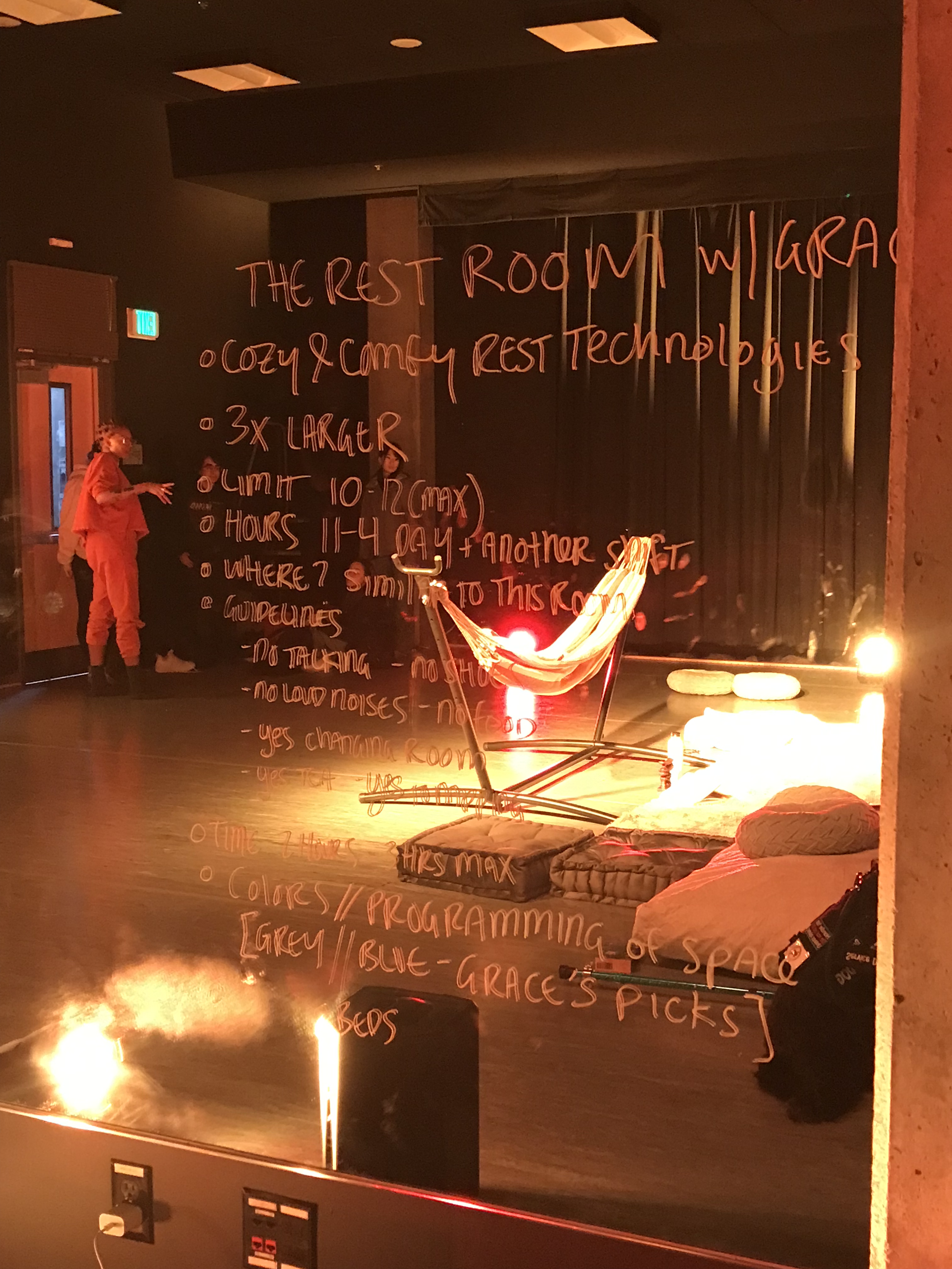 Throughout the days that The Dreaming Room was open, students trickled in to visit, whether with their classes or wandering in due to interest in the warm lighting peeking through the windows. Mia Imani mentioned that over 100 students visited and the room was a place of respite where students rested, snored, and inquired what a more permanent resting room on campus might be like. As she spoke with students, Mia Imani shared the facets of her work, which involve learning about global sleep cultures, researching sleep technologies and creating installations centered around the idea of radical rest.